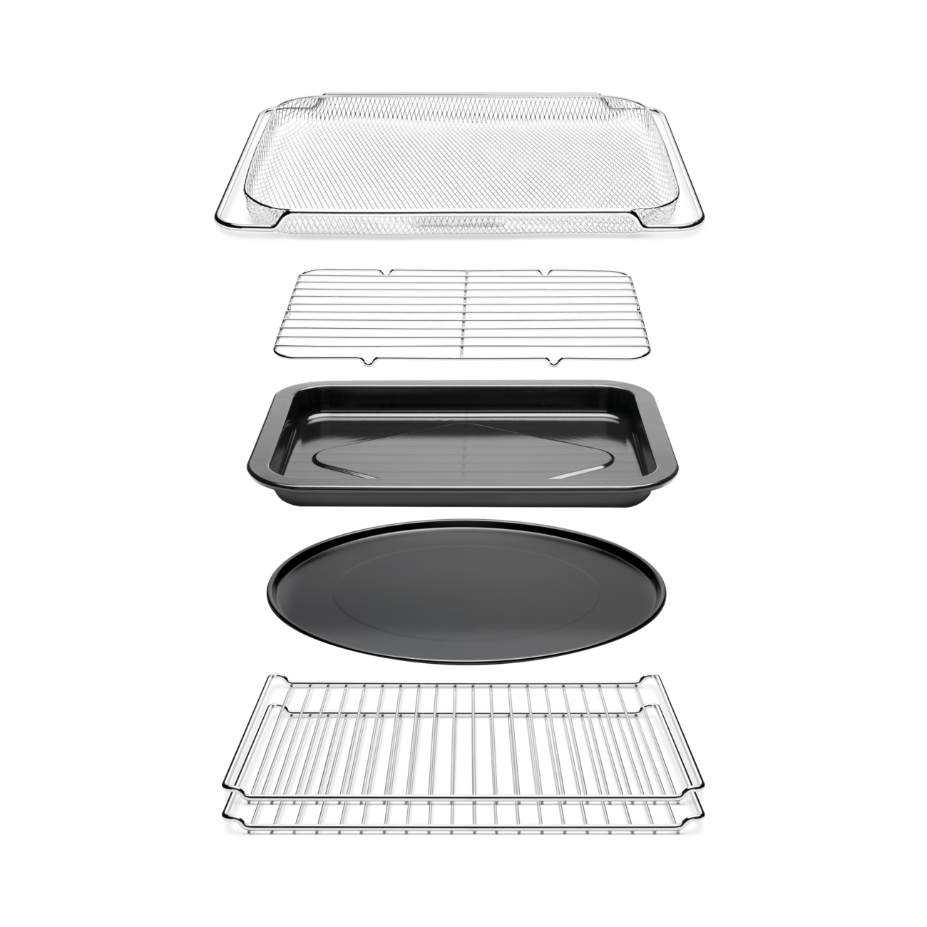 Вътрешният обем от 28 литра позволява едновременно препичане на до 9 филийки хляб, пържене на въздух до 1 кг любими ястия като пържени картофи и пилешки крилца, печене на пуйка от 6 кг и удобно побира повечето тави с размери 23 x 33 см и форми за мъфини с обем 12 чаши.